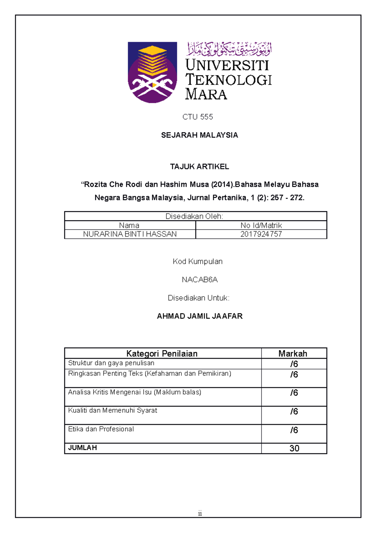 Ulasan Artikel Bahasa Melayu Bahasa Negara Bangsa Malaysia Ctu 555 Sejarah Malaysia Tajuk Artikel Studocu